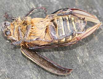 The long-haired June beetle or Polyphylla crinita is found inhabiting sandy locations in California, Oregon, Washington and British Columbia. These beetles buzz about loudly at night, attracted to lights. The hissing sound of this scarab beetle may attract attention when trapped in the web of the black widow spider, where I've found it caught a few times. Its larvae feed on sod and the roots of various shrubs and trees, including fruit trees, and may stress or kill them. Adult beetles are feed on conifer needles.